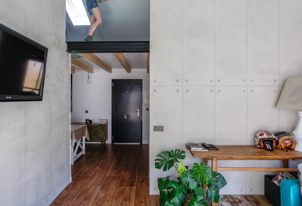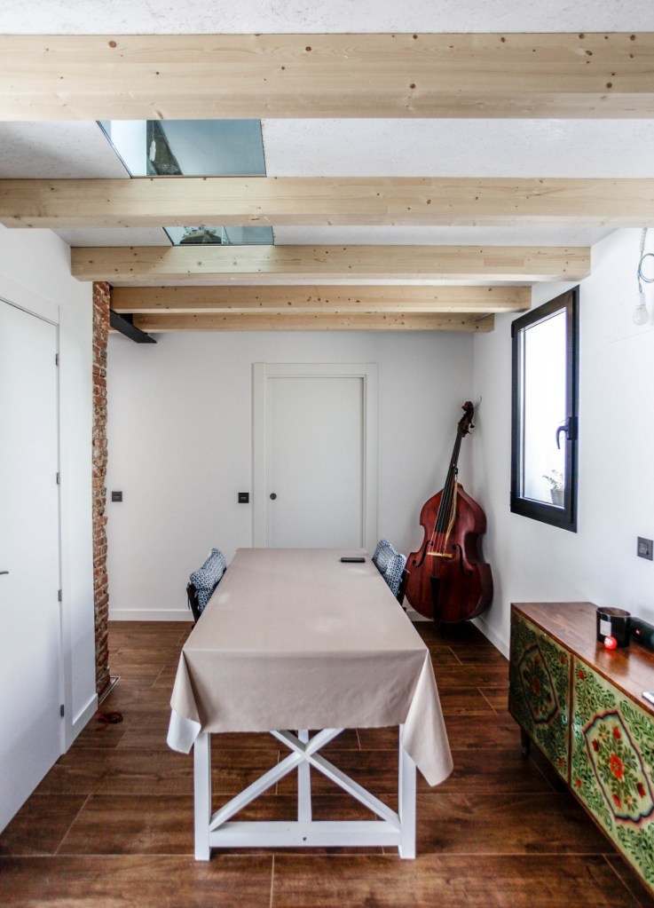 70 m2 en los que pequeñas habitaciones se distribuían bajo un falso techo de altura libre mínima se transformaron en 70 m2 luminosos abiertos a un patio donde los espacios dialogan entre sí. Se amplía el volumen habitable incluyendo el bajo cubierta como parte útil de la vivienda.