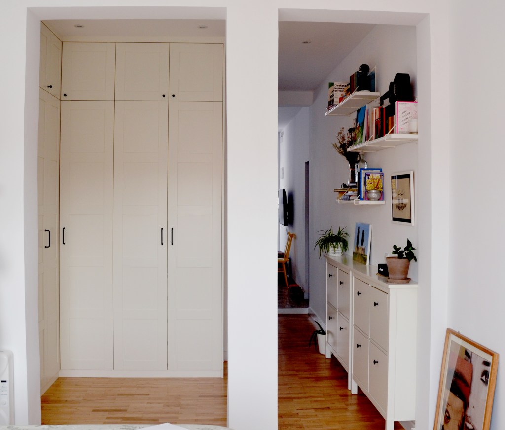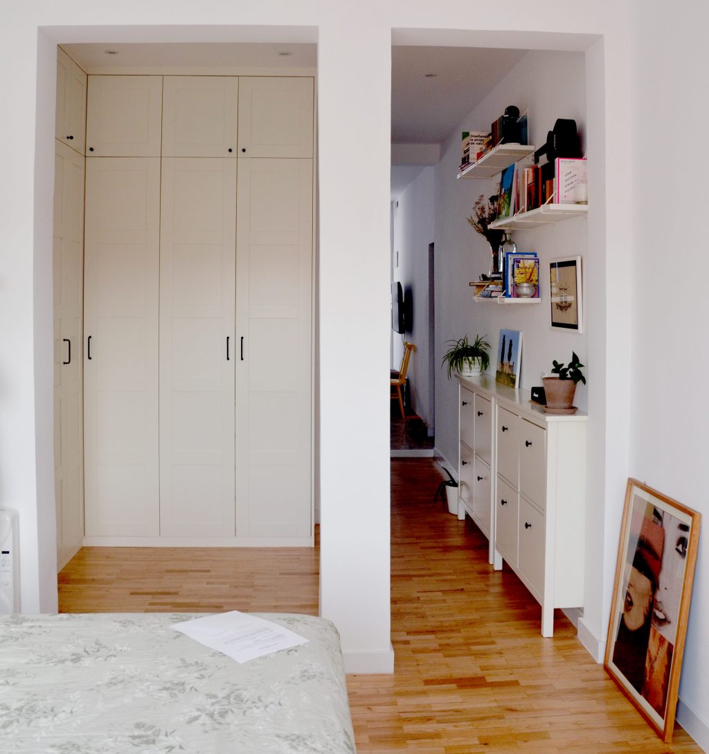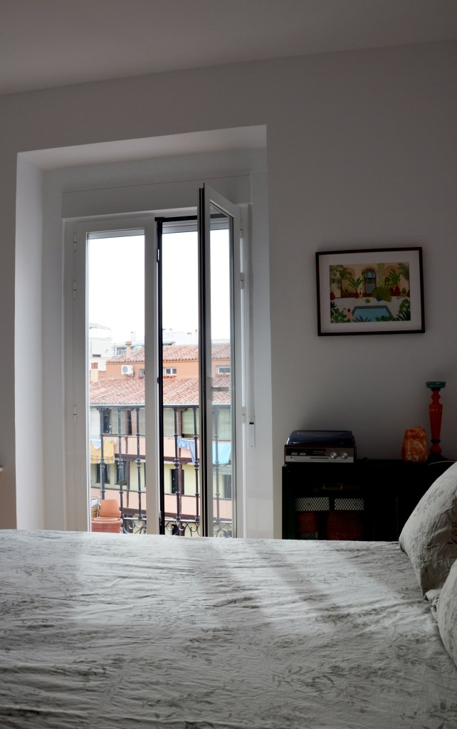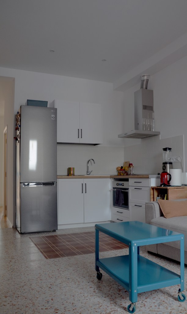 Partimos de una vivienda muy compartimentada con dos alcobas, introvertida, oscura y poco funcional. Se redistribuye completamente la vivienda para aprovechar al máximo la luz de la ventana al amplio patio sur y del balcón. Se abren y combinan los espacios, se reubican las instalaciones ganando funcionalidad y amplitud. Mantenemos todos los elementos originales posibles, recuperando carpinterías y pavimentos.