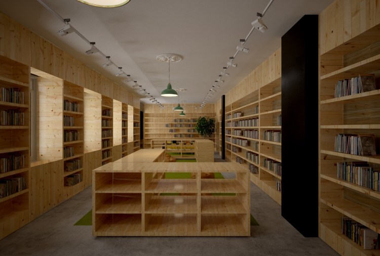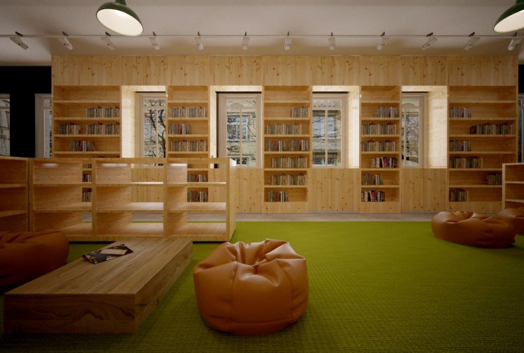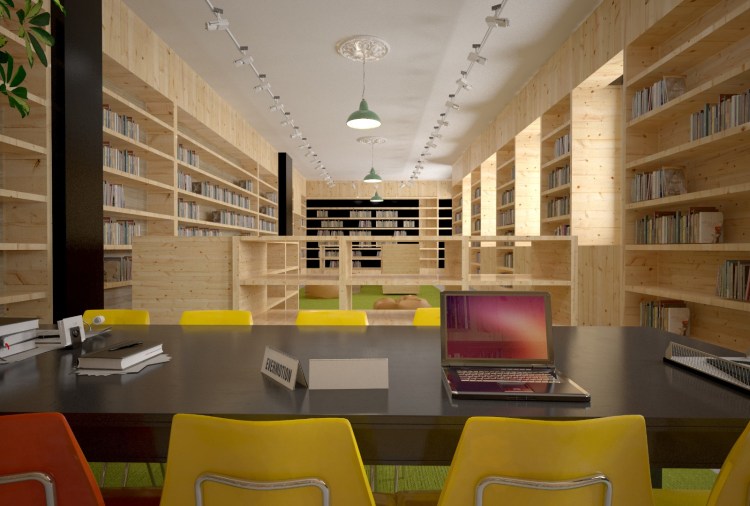 Una de las propuestas para la biblioteca de la nueva sede del Instituto Goethe en Cracovia. Rehabilitación de un edificio histórico, abriendo espacios y dotándolos de flexibilidad y calidez, con la madera como protagonista.