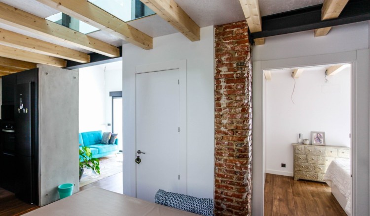 70 m2 en los que pequeñas habitaciones se distribuían bajo un falso techo de altura libre mínima se transformaron en 70 m2 luminosos abiertos a un patio donde los espacios dialogan entre sí. Se amplía el volumen habitable incluyendo el bajo cubierta como parte útil de la vivienda.